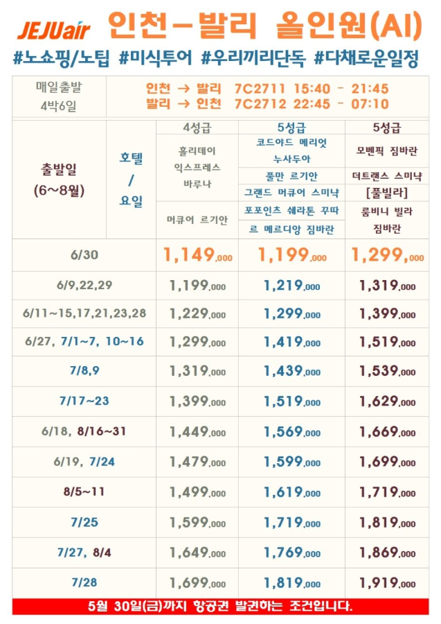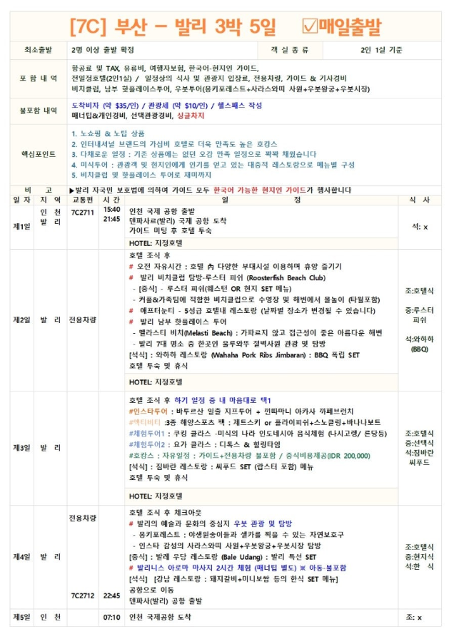 | ⏱ 항공편 | 7C2711 인천 15:40 → 덴파사르 21:45 7C2712 덴파사르 22:45 → 인천 07:10 |