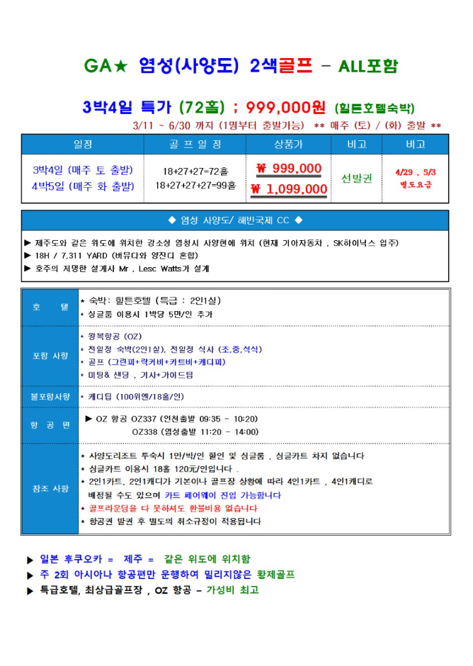 | 3월11일~6월30일 | 999,000원 (3박4일) / 1,099,000원 (4박5일) | 성수기 |