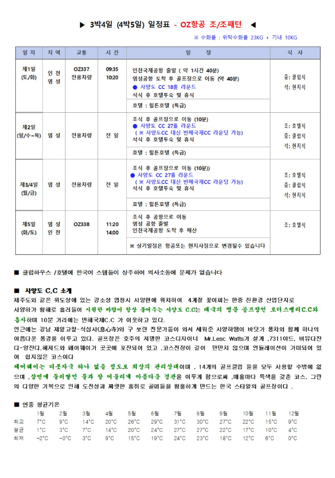 💡 중국 염성은 제주도·후쿠오카와 같은 위도로 기온이 쾌적해요!🗓 일정 및 라운딩 코스 안내