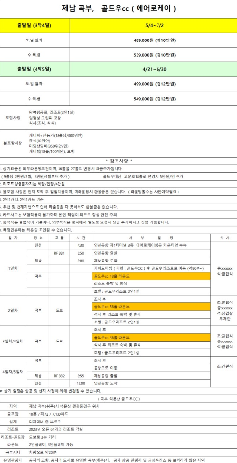 | 에어로케이 3박4일 | 489,000원 ~ 539,000원 | 90홀 |