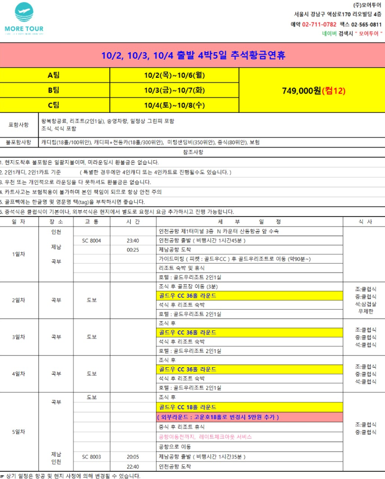 | 추석특가 4박5일 | 749,000원 | 126홀 |